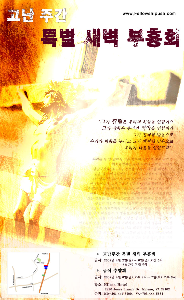 고난주간 새벽 부흥회 일시: 2007년 4월 2일(월) ~ 6일(금) 오전 5시 장소: Hilton Hotel - Tyson's Corner ; 7920 Jones Branch Dr, Mclean, VA 22102 (작년 장소와 동일) 문의: MD-301.444.3100, VA-703.444.5634 금식 수양회 일시: 2007년 4월 6일(금) 오후 7시 ~ 7일(토) 오후 3시 장소: Hilton Hotel - Tyson's Corner ; 7920 Jones Branch Dr, Mclean, VA 22102 (작년 장소와 동일) * 더 자세한 약도는 이곳을 클릭 하세요 *