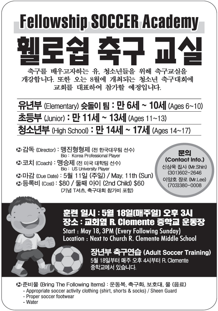 등록비: $80 / 둘째 아이 $60 (T 셔츠, 축구대회 참가비 포함)