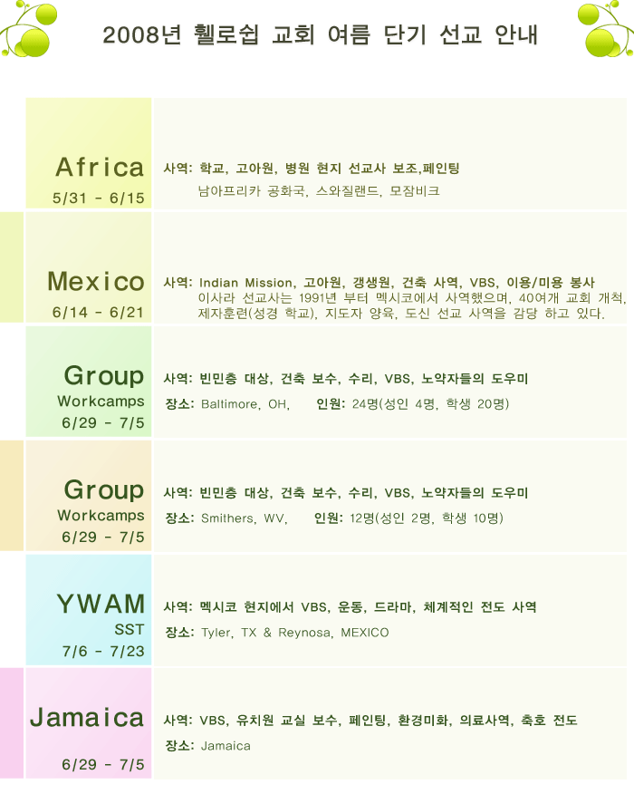 2008년도 여름 단기 선교를 위와 같이 준비하고 있습니다.