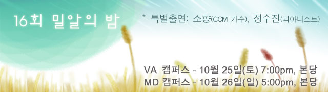 제16회 밀알의 밤이 10월 25일(토) 오후7시에 휄로쉽교회(김원기목사) 버지니아 캠퍼스와 10월 26일(주일) 오후5시에 휄로쉽교회 매릴랜드 캠퍼스에서 열린다.